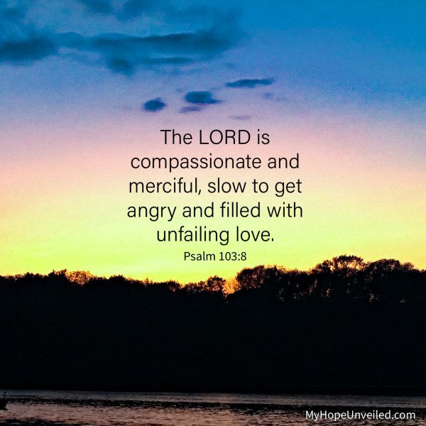8 The LORD is compassionate and merciful, slow to get angry and filled with unfailing love.  9 He will not constantly accuse us, nor remain angry forever.  10 He does not punish us for all our sins; he does not deal harshly with us, as we deserve.  11 For his unfailing love toward those who fear him is as great as the height of the heavens above the earth.  12 He has removed our sins as far from us as the east is from the west.  13 The LORD is like a father to his children, tender and compassionate to those who fear him.